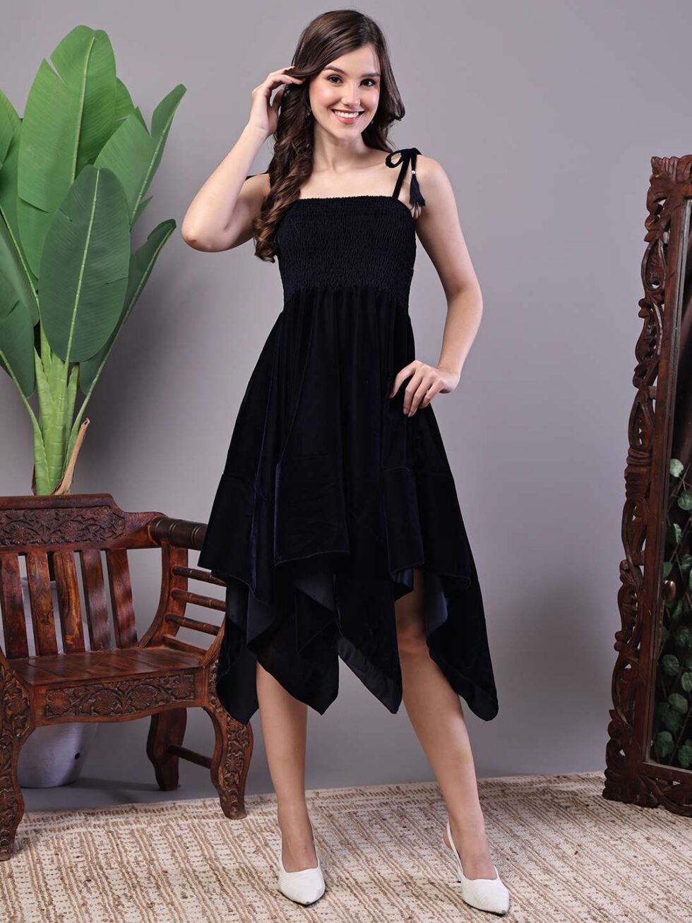 Be the first to review “Women’s Junglee Black Velvet Party Midi Dress with Asymmetrical Hemline Midi Dresses”